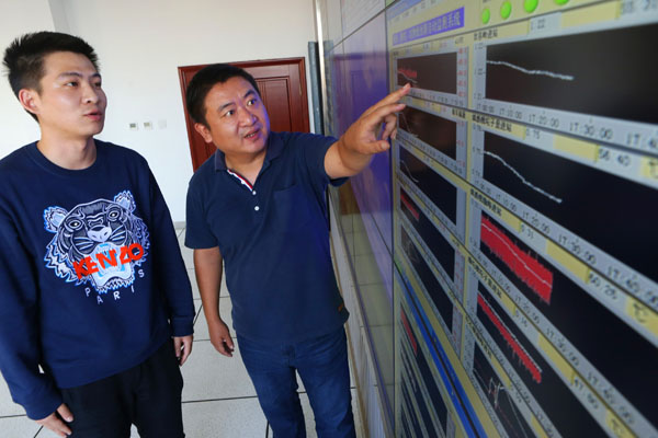 9月6日,安曉峰(右)與工作人員察看輸油管道監(jiān)測系統(tǒng)